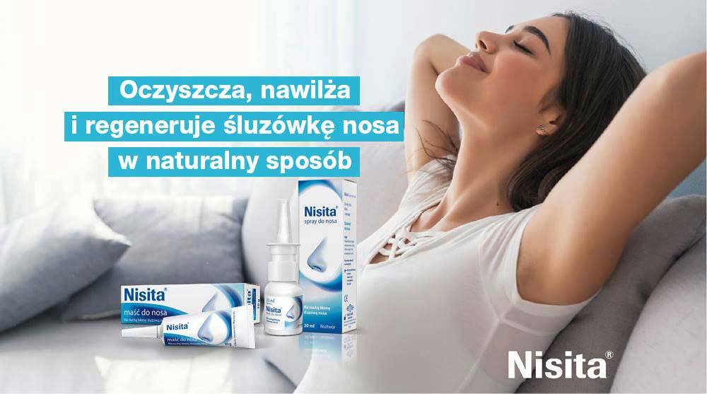 Utrzymujcie śluzówkę nosa w nawilżeniu za pomocą maści i sprayu do nosa Nisita®. W skład Nisita® wchodzą dwie sole: chlorek sodu i wodorowęglan sodu. Skład soli odpowiada potrzebom śluzówki nosa, co przyspiesza jej regenerację. Jony sodu i chloru odpowiadają za utrzymywanie ciśnienia osmotycznego, a więc i wielu funkcji organizmu. Dzięki swojemu działaniu higroskopijnemu tworzą w nosie wilgotne środowisko.