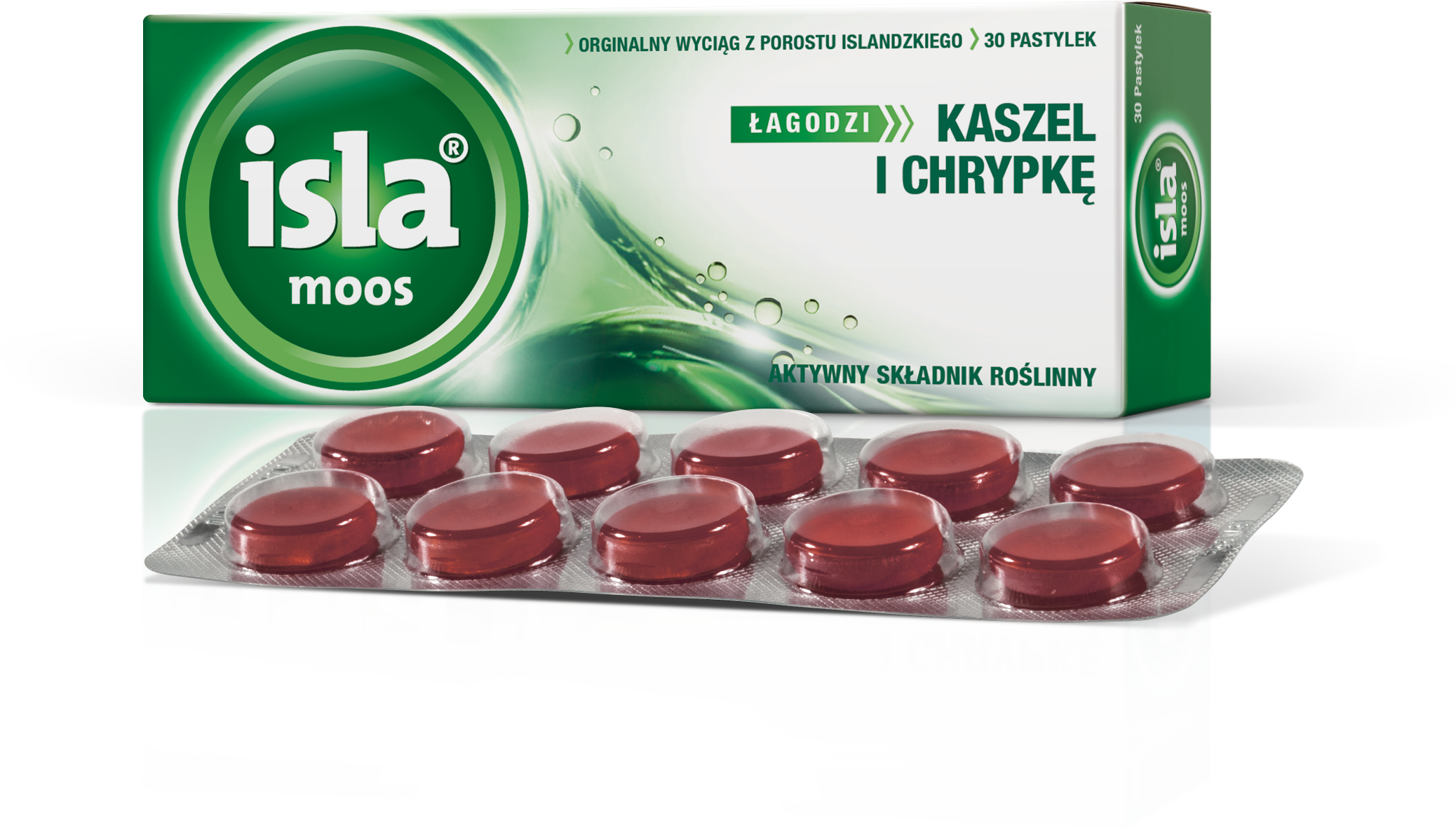 Pastylki isla® moos z aktywnym wyciągiem z porostu islandzkiego pomagają łagodzić objawy chrypki i podrażnionego gardła. isla® moos tworzy powłokę osłaniającą błonę śluzową jamy ustnej i gardła, zapewniając jej ochronę. Kojące działanie isla® moos pomaga przywrócić równowagę podrażnionej błonie śluzowej. Nazwa wytwórcy: Engelhard Arzneimittel GmbH & Co. KG. Podmiot prowadzący reklamę: Salveo Poland Sp. z o.o.